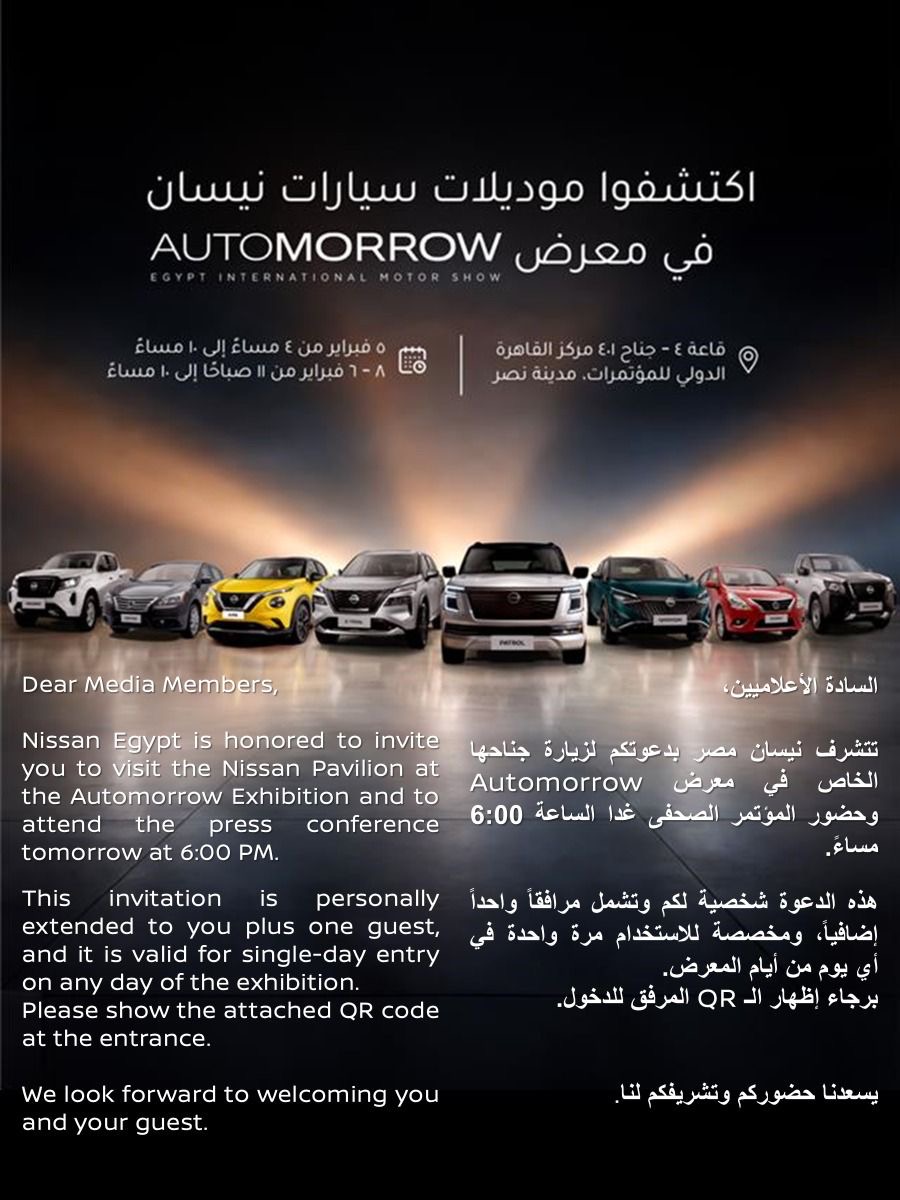 وتدعو نيسان مصر زوار المعرض لزيارة جناحها خلال أيام المعرض من 5 إلى 8 فبراير، للتعرّف على أحدث الطرازات والاستفادة من العروض المتاحة، والتواصل مع ممثلي نيسان للحصول على تفاصيل المواصفات، المزايا، وخيارات الشراء.